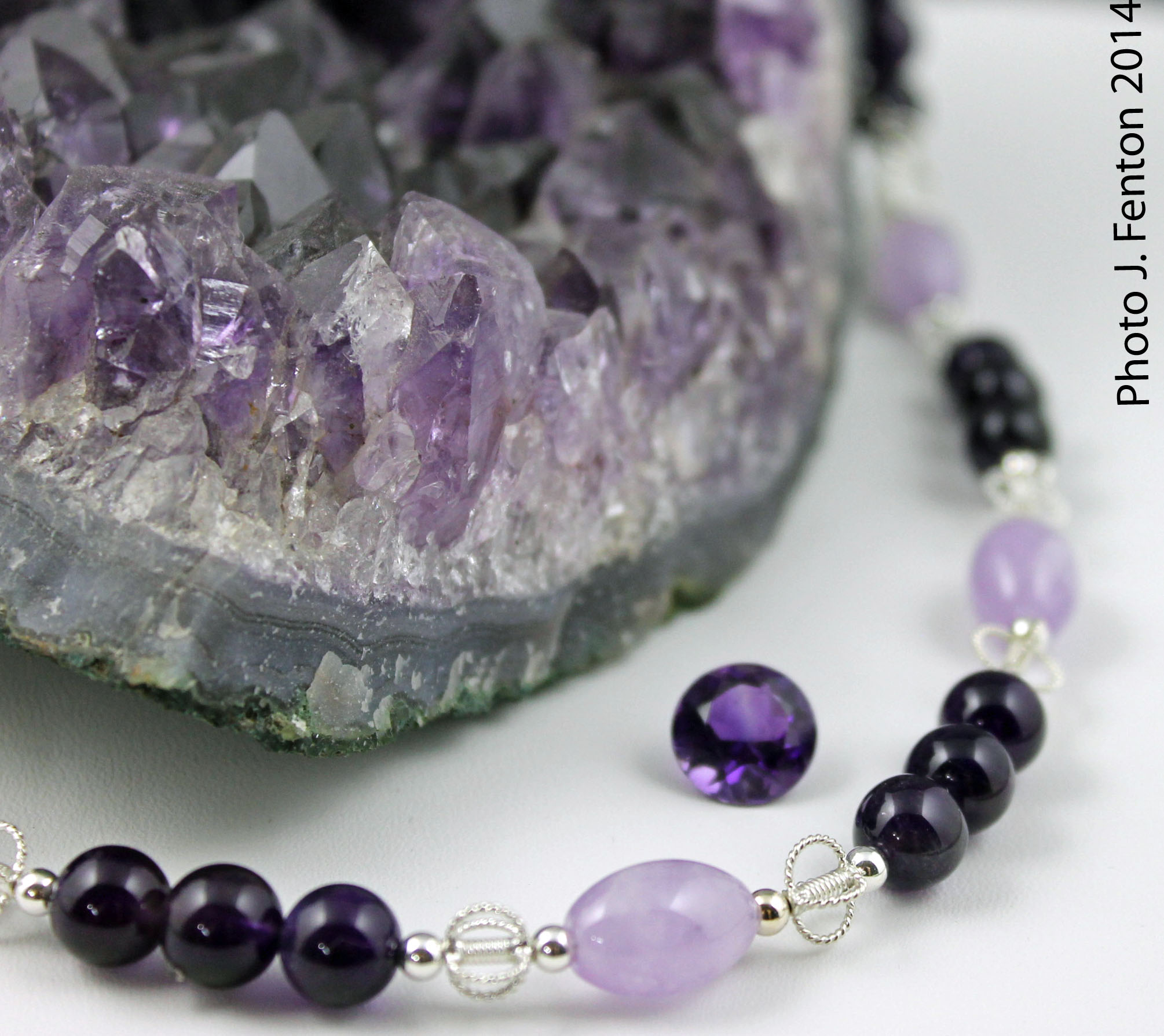 Last month I told you about the many different colors of garnets, which are caused by differences in chemical formula. Pure quartz (chemical formula SiO2) is colorless (and is called “rock crystal” in the jewelry industry). The different colors of quartz* are caused by defects in the crystal structure rather than by a consistent change in the chemical formula. This often causes different amounts of color within even a single crystal (“color zoning”). For amethyst, iron, and possibly aluminum, impurities are believed to cause the purple color.