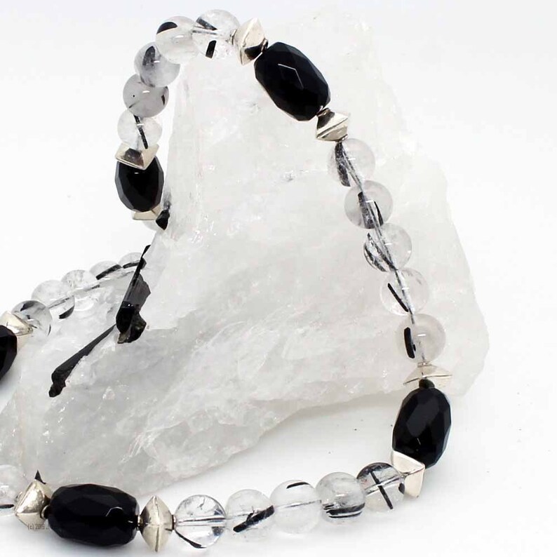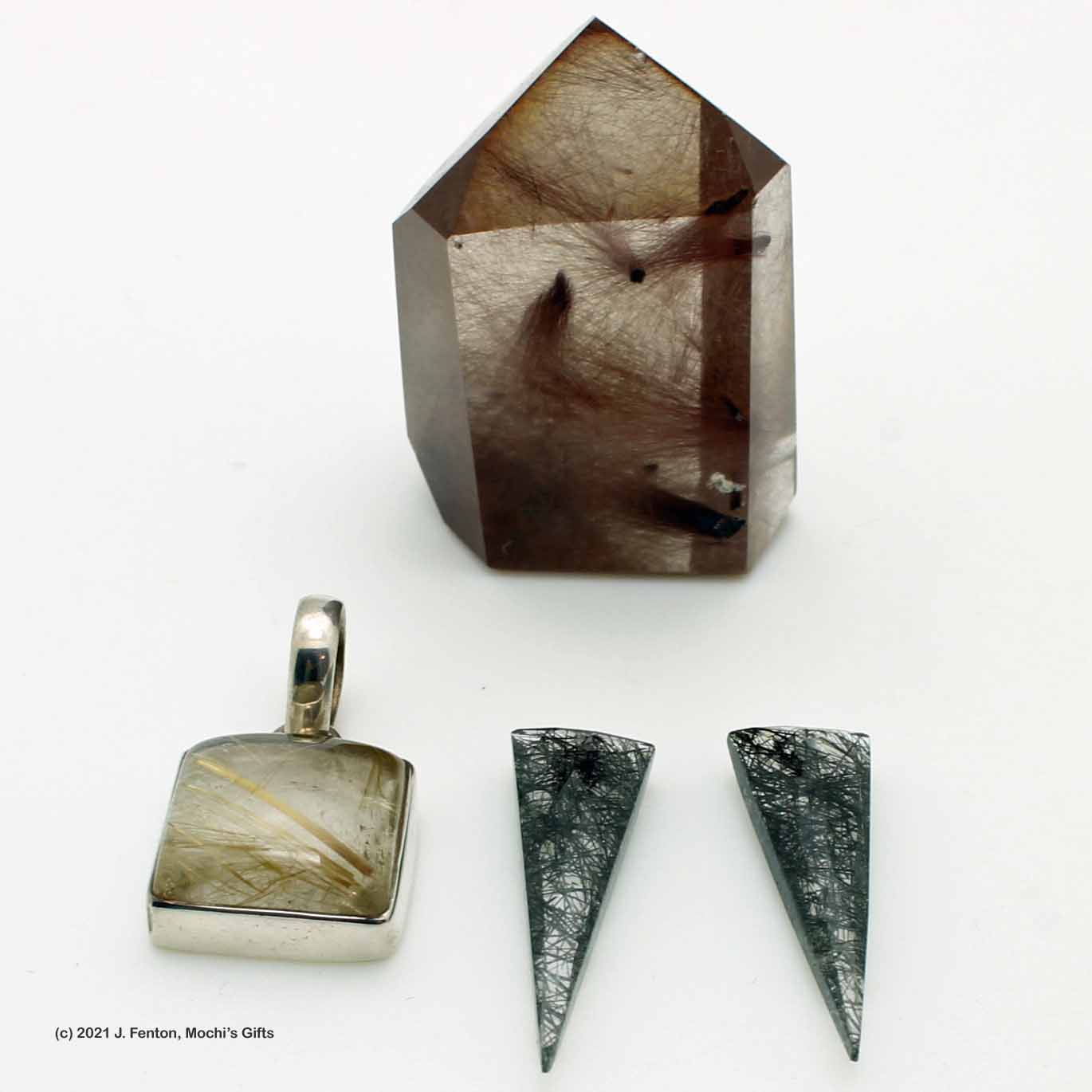 Tourmalinated quartz: While tourmaline comes in a rainbow of colors, tourmalinated quartz used in jewelry usually contains black crystals and can look similar to rutilated quartz. The cross section of a tourmaline crystal intersecting the surface of the quartz may show a characteristic modified triangular or hexagonal shape.